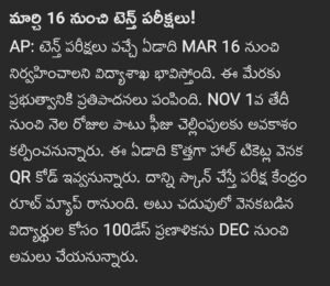 ఆంధ్రప్రదేశ్లో టెన్త్ పరీక్షలకు సంబంధించి మనకు మార్చ్ 16వ తేదీ నుంచి నిర్వహిస్తారు అని చెప్పి విద్యాశాఖ ప్రస్తుతానికి సిద్ధమయింది. అయితే ఈ పరీక్షలకు సంబంధించిన ఫీజు నవంబర్ ఒకటవ తేదీ నుంచి ఒక 30 రోజులు అంటే ఒక నెల రోజులు పాటు ఫీజులు మనం కట్టుకోవచ్చు. అయితే ఈసారి సరికొత్తగా మళ్లీ మనకి హాల్ టికెట్స్ వెనక QR CODE కూడా ఇవ్వనున్నట్లు విద్యాశాఖ చెప్తుంది. అయితే స్టూడెంట్స్ అందరూ కూడా ఆ యొక్క క్యూ ఆర్ కోడ్ ని స్కాన్ చేసి పరీక్ష కేంద్రం రూట్ మ్యాప్ అనేది మీకు కనిపిస్తుంది అని చెప్పి విద్యాశాఖ క్లియర్ గా చెప్తుంది.
