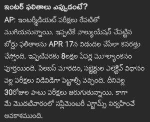 ఆంధ్రప్రదేశ్ రాష్ట్రంలో మనకు ఇంటర్మీడియట్ సంబంధించిన ఫలితాలు రావాలి అంటే పరీక్షలు అనేవి కంప్లీట్ అవ్వాలి. అయితే ఈ యొక్క పరీక్షలకు సంబంధించి రేపటితో కంప్లీట్ అవుతున్నాయి. ఇప్పటికే వాల్యుయేషన్ కూడా కంప్లీట్ కావస్తుంది. April 17th తేదీన ఈ యొక్క ఇంటర్మీడియట్ ఫలితాలు అనేవి విడుదల అవ్వడానికి ఎక్కువ అవకాశాలు ఉన్నట్టు అధికారులు చెబుతున్నారు.