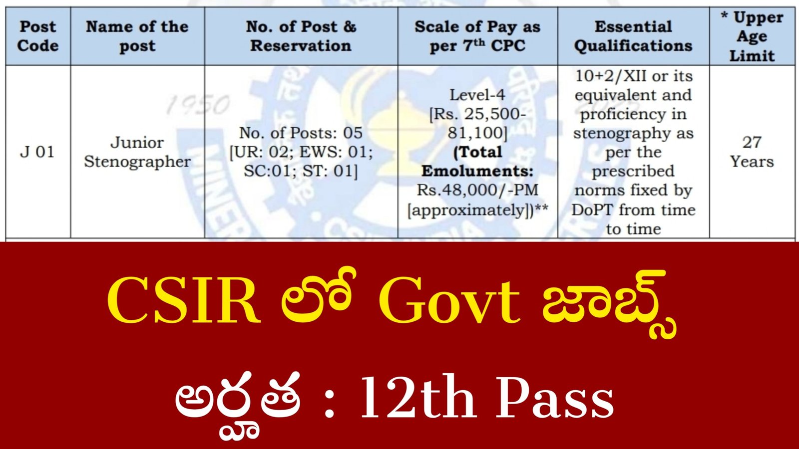 CSIR ద్వారా మనకి కేవలం 12వ తరగతి క్వాలిఫికేషన్ తో అప్లై చేసుకునే విధంగా మనకు జూనియర్ స్టెనోగ్రాఫర్ ఉద్యోగాలకు సంబంధించిన గ్రూప్ సి ఉద్యోగాలు విడుదల చేయడం జరిగింది.