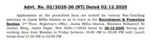 జామియా మిలియా ఇస్లామియా బోర్డు ఉద్యోగలకు సంబంధించినటువంటి ఇంపార్టెంట్ విషయానికి వచ్చినట్లయితే అప్లికేషన్స్ అనేవి మీరు డిసెంబర్ 26 వరకు కూడా దరఖాస్తు సమర్పించే అవకాశాన్ని మనకు ఈ యొక్క సంస్థ ఇవ్వడం జరిగింది. మీ అప్లికేషన్ రిజెక్ట్ అవ్వకూడదు అంటే ఇచ్చిన కడుపులోపు మాత్రమే అప్లికేషన్స్ అనేవి పెట్టేసేయండి.