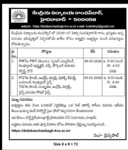 ఈ కేంద్రీయ విద్యాలయాలను మనకి హైదరాబాదులో అయితే ఉన్నాయి. PRT, PGT, TGT, స్పెషల్ ఎడ్యుకేటర్ కంప్యూటర్ ఇన్స్పెక్టర్ నర్స్ కౌన్సిలర్ స్పోర్ట్స్ COACH వంటి వివిధ రకాల జాబ్స్ ఉన్నాయి.