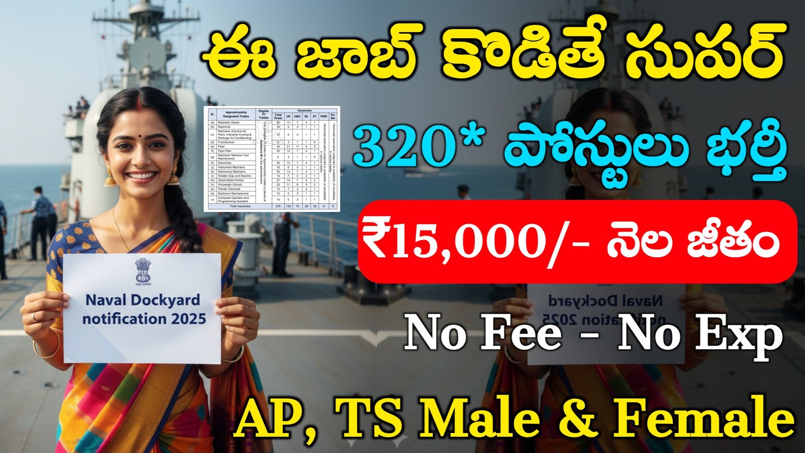 Naval dockyard నుండి మనకే మొత్తం 320 పోస్టులకు సంబంధించిన ట్రేడ్ అప్రెంటిస్ పోస్టులకు సంబంధించిన కొత్త నోటిఫికేషన్ అయితే రావడం జరిగింది.