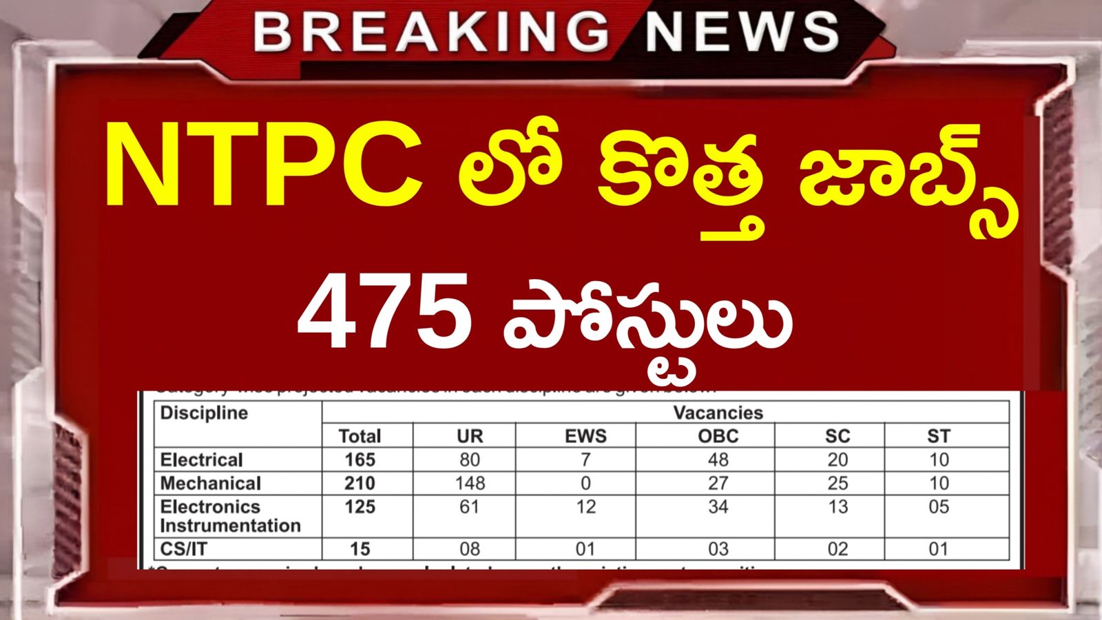 NTPC limited సంబంధించి మొత్తంగా చూసుకున్నట్లయితే కనుక మనకు 475 ఇంజినీరింగ్ ఎగ్జిక్యూటివ్ ట్రైనీ అనే జాబ్స్ అనేవి రిలీజ్ చేయడం జరిగింది.