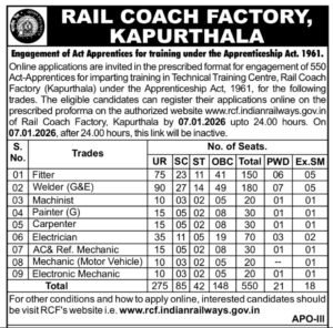Rail Coach Factory Kapurthala Jobs 2025: