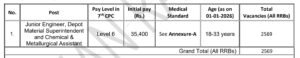 రైల్వే శాఖ నుంచి మనకి అధికారికంగా రైల్వే రిక్రూట్మెంట్ బోర్డ్ తరఫునుంచి జూనియర్ ఇంజనీర్ – JE పోస్టులకు సంబంధించి 2569 పోస్టులు విడుదల చేశారు. మరి ఈ పోస్టులకు సంబంధించిన పూర్తి వివరాలు ఇప్పుడు మనం తెలుసుకుందాము. వీటికి సంబంధించి మీరు ఎప్పటి వరకు అప్లై చేయొచ్చు మరియు బీటికి సంబంధించిన క్వాలిఫికేషన్ ఏంటి మరియు మిగతా వివరాలు తెలుసుకుందాం.