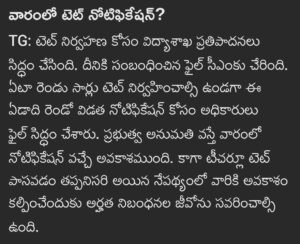 తెలంగాణ రాష్ట్ర వ్యాప్తంగా ఉన్నటువంటి నీరు ఉద్యోగ అభ్యర్థులందరికీ శుభవార్త. వారం రోజుల్లోనే తెలంగాణలో టెట్ నోటిఫికేషన్ జారీ చేస్తాము అని చెప్పి విద్యాశాఖ చెప్పడం జరిగింది. మరి టిఎస్సి ఎవరైతే రాయడానికి సిద్ధంగా ఉన్నారో వాళ్ళందరికీ కూడా మరొక టెట్ అవకాశం ఇచ్చారు కాబట్టి మీ యొక్క స్కోర్ అనేది పెంచుకునే ప్రయత్నం చేయండి.