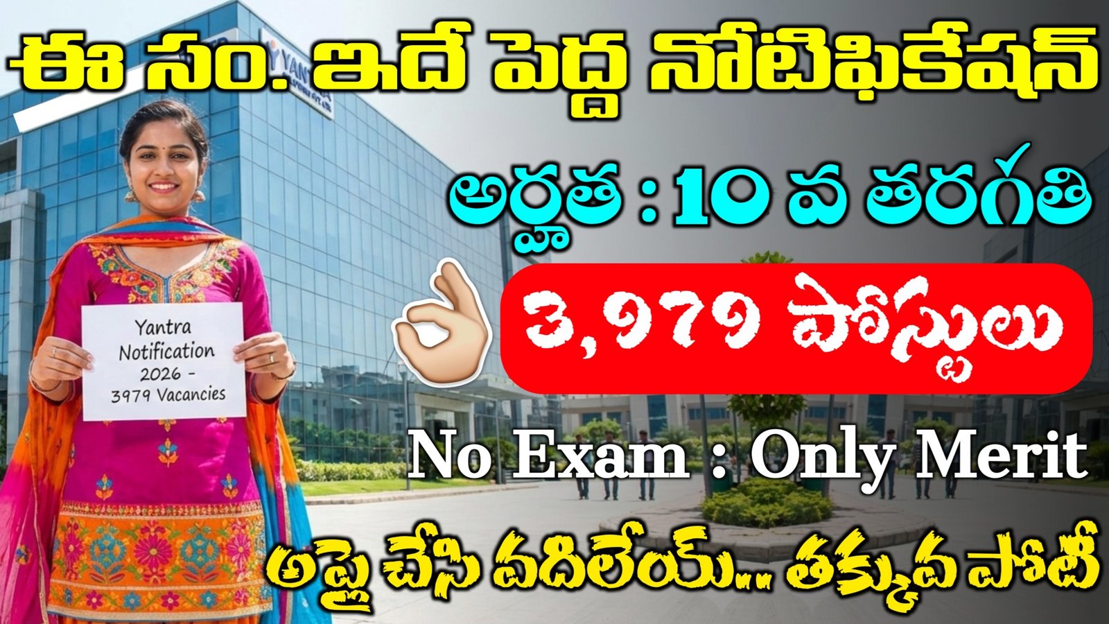 Yantra నుండి మనకే అధికారికంగా 3979 పోస్టులకు సంబంధించి కేవలం పదవ తరగతి క్వాలిఫికేషన్ అప్లై చేసుకునే విధంగా సూపర్ నోటిఫికేషన్ అయితే వచ్చేసింది. ఈ జాబ్స్ కోసం చాలామంది చాలా రోజులుగా వెయిట్ చేస్తున్నారు ఫైనల్ గా మనకు నోటిఫికేషన్ వచ్చింది కాబట్టి డీటెయిల్స్ అన్ని కూడా తెలుసుకొని అప్లై చేసుకోవడానికి ట్రై చేయండి.
